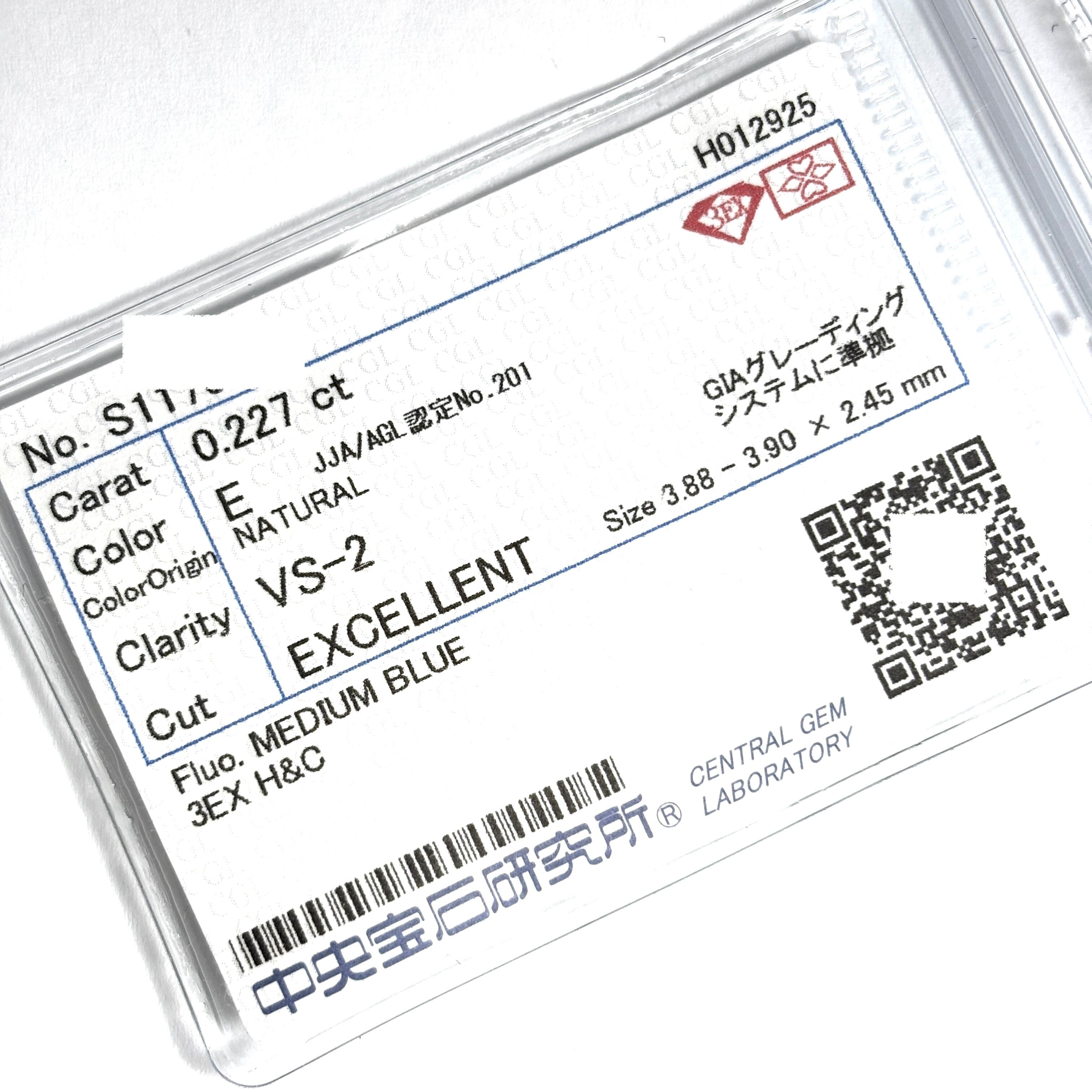 【卸売価格】0.227ct E VS2 3EX H&C 天然 ダイヤモンド 無傷 無色 透明 稀少 希少石 ダイアモンド 中央宝石研究所 ラウンドブリリアントダイヤモンド 婚約指輪 3.8mm 0.2ct 0.2 ct 0.2カラット Natural Diamond Round Brilliant