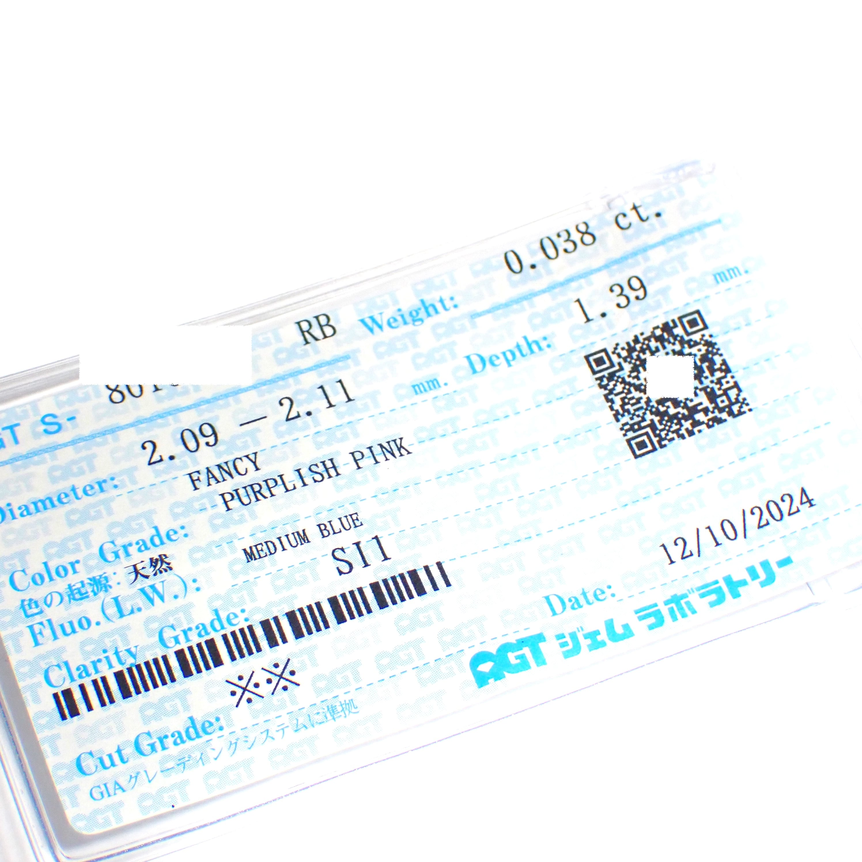 【特別価格】0.038ct Fancy Purplish Pink SI1 ラウンド ピンク ダイヤモンド ルース 裸石 天然 AGTソーティング ピンクダイヤモンド 2.0mm Natural Pink Diamond Round Brilliant