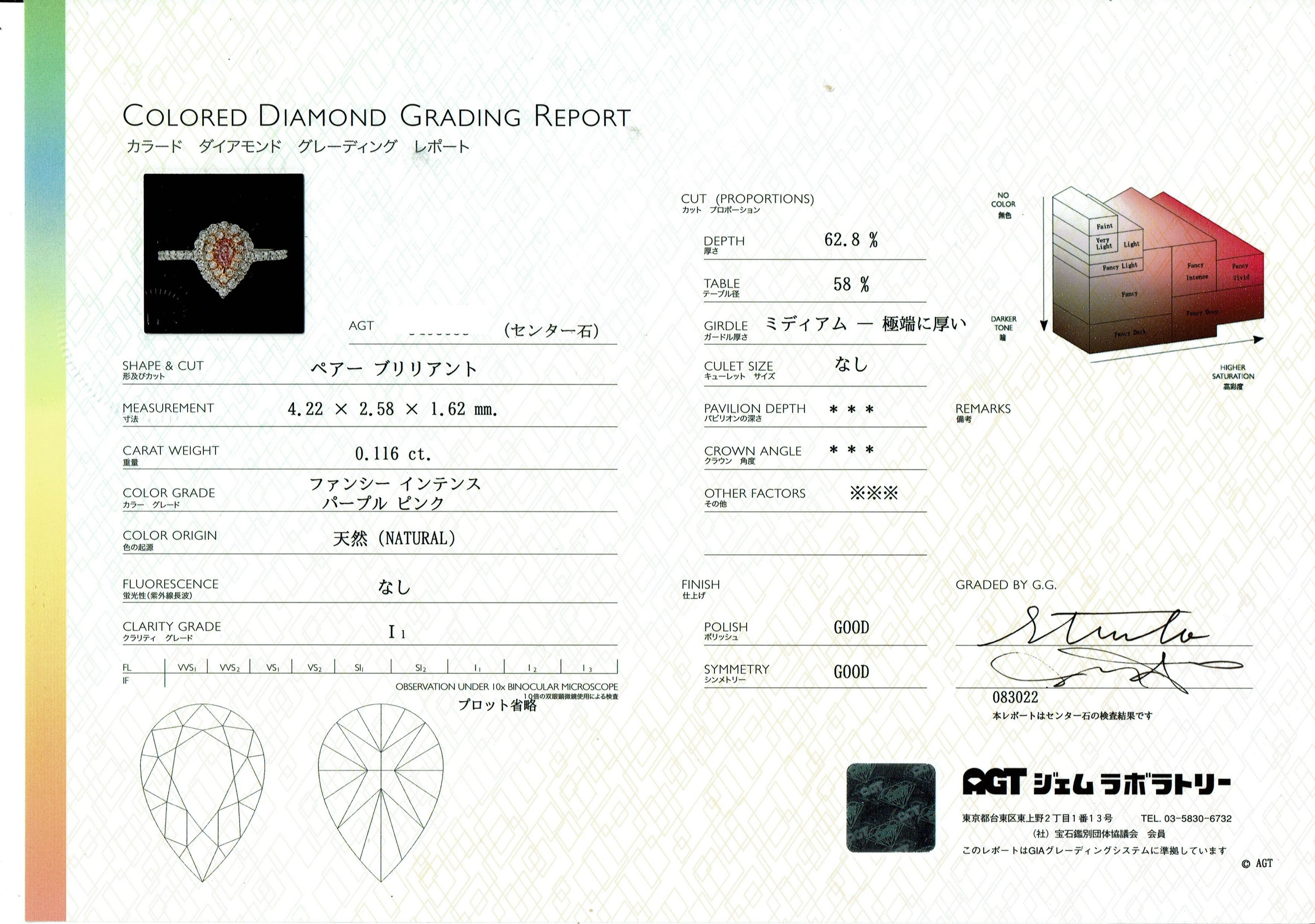 主石 : 天然ピンクダイヤ 0.116ct Fancy Intense Purple Pink (AGT鑑定書)