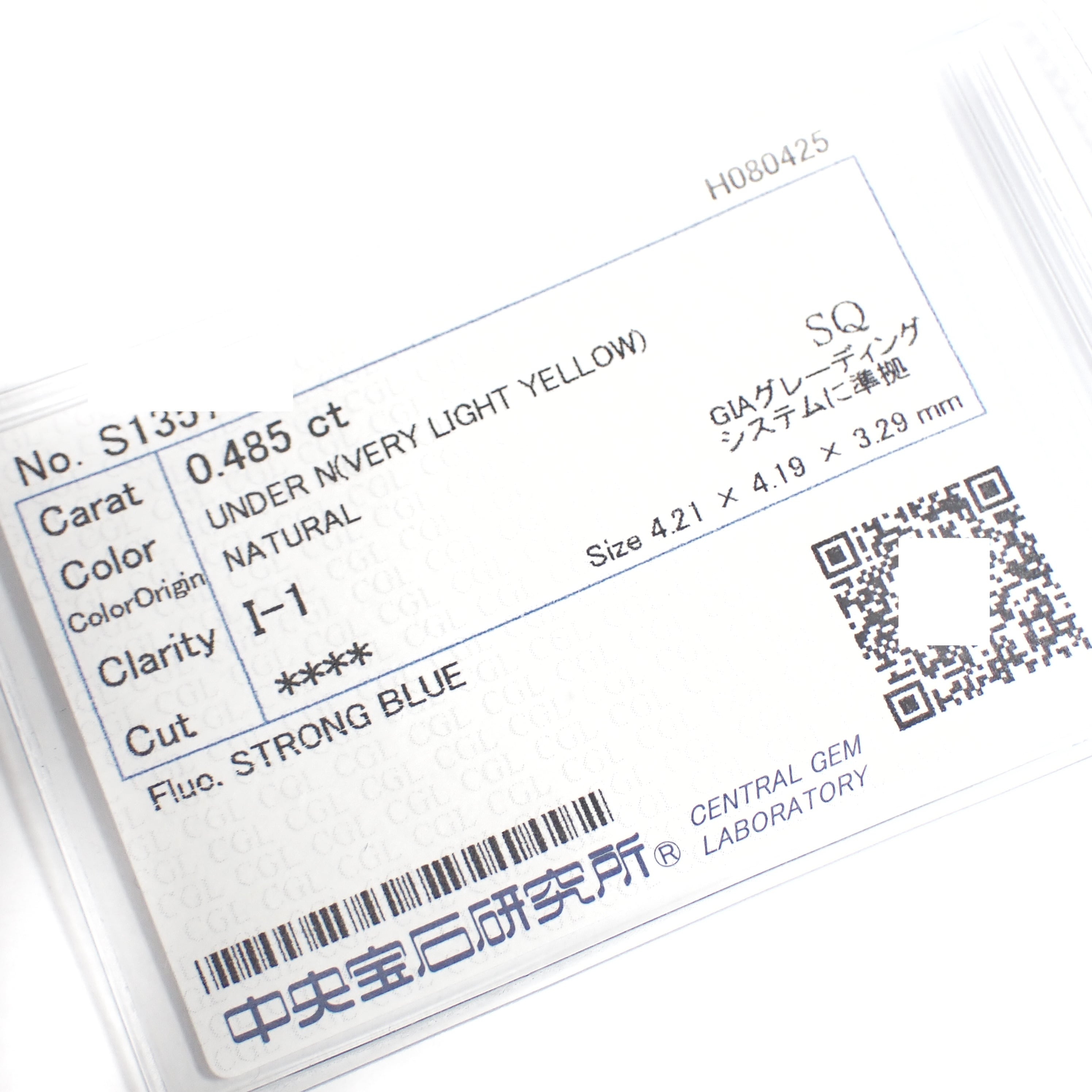 【特価】 大粒 プリンセスカット 0.485ct Very Light Yellow 天然 イエロー ダイアモンド ルース 裸石 天然 稀少 希少石 ダイアモンド 中央宝石研究所 ダイヤモンド Princess Cut Yellow Diamond 0.4ct 0.4carat
