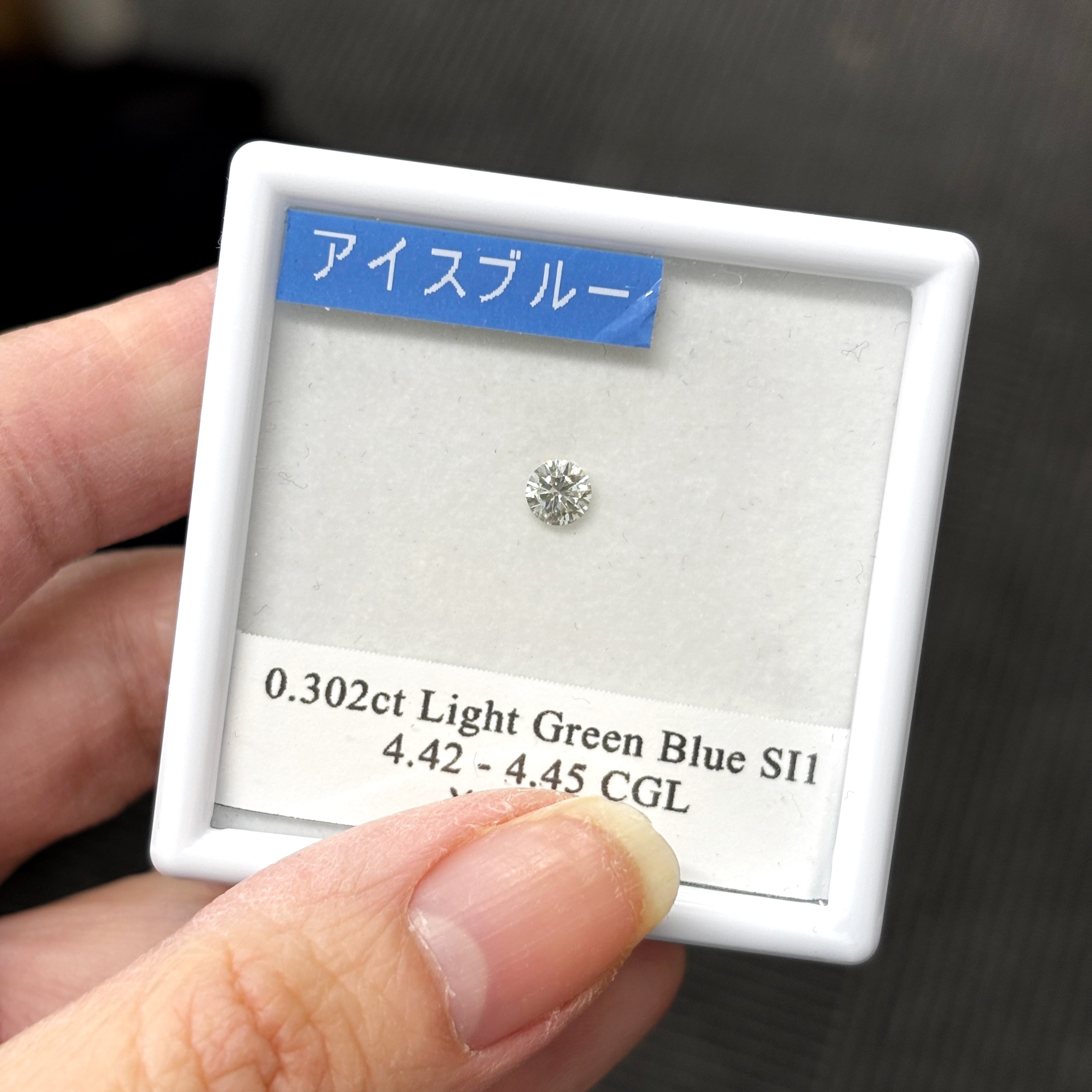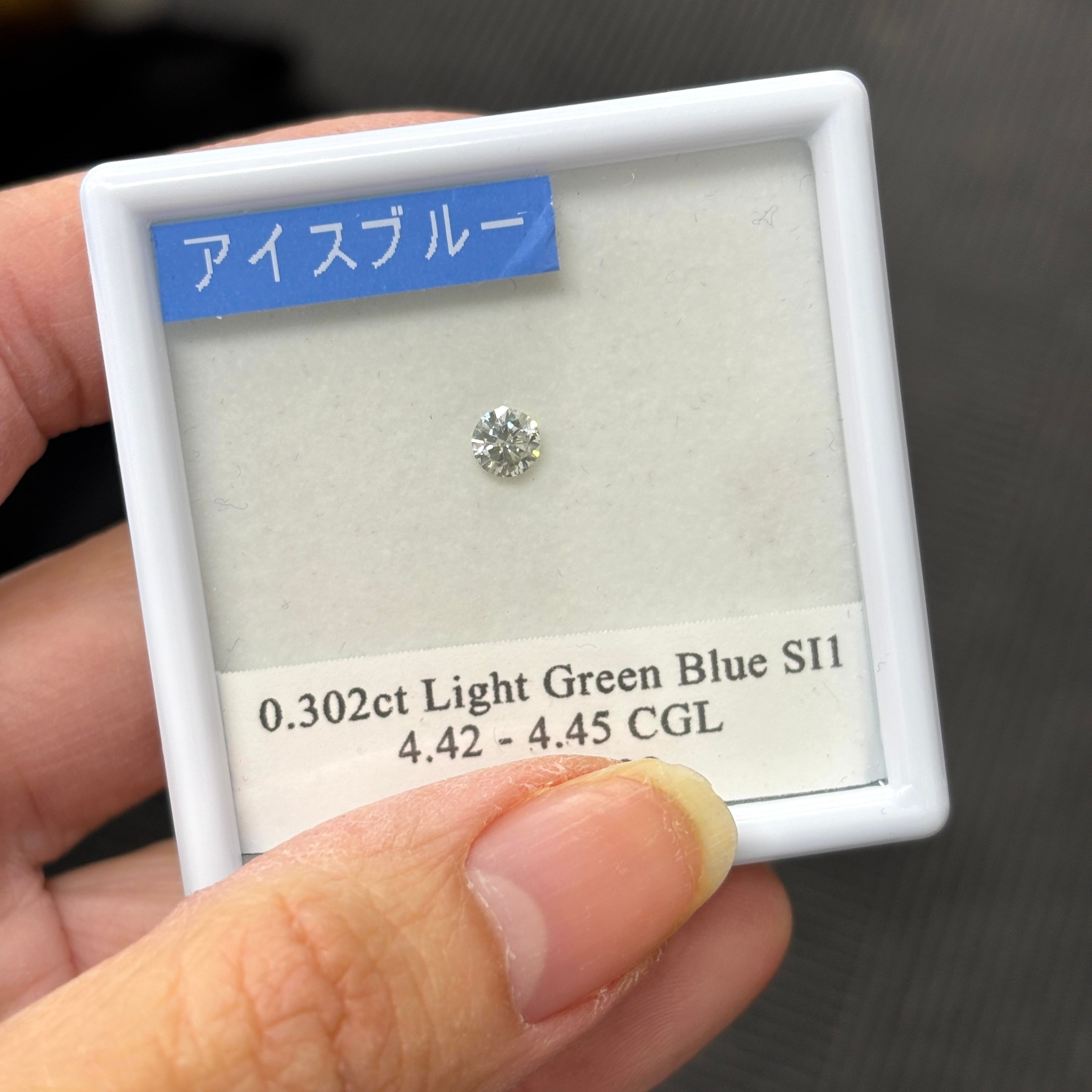 0.302カラットの Light Green Blue トリートダイヤモンド。