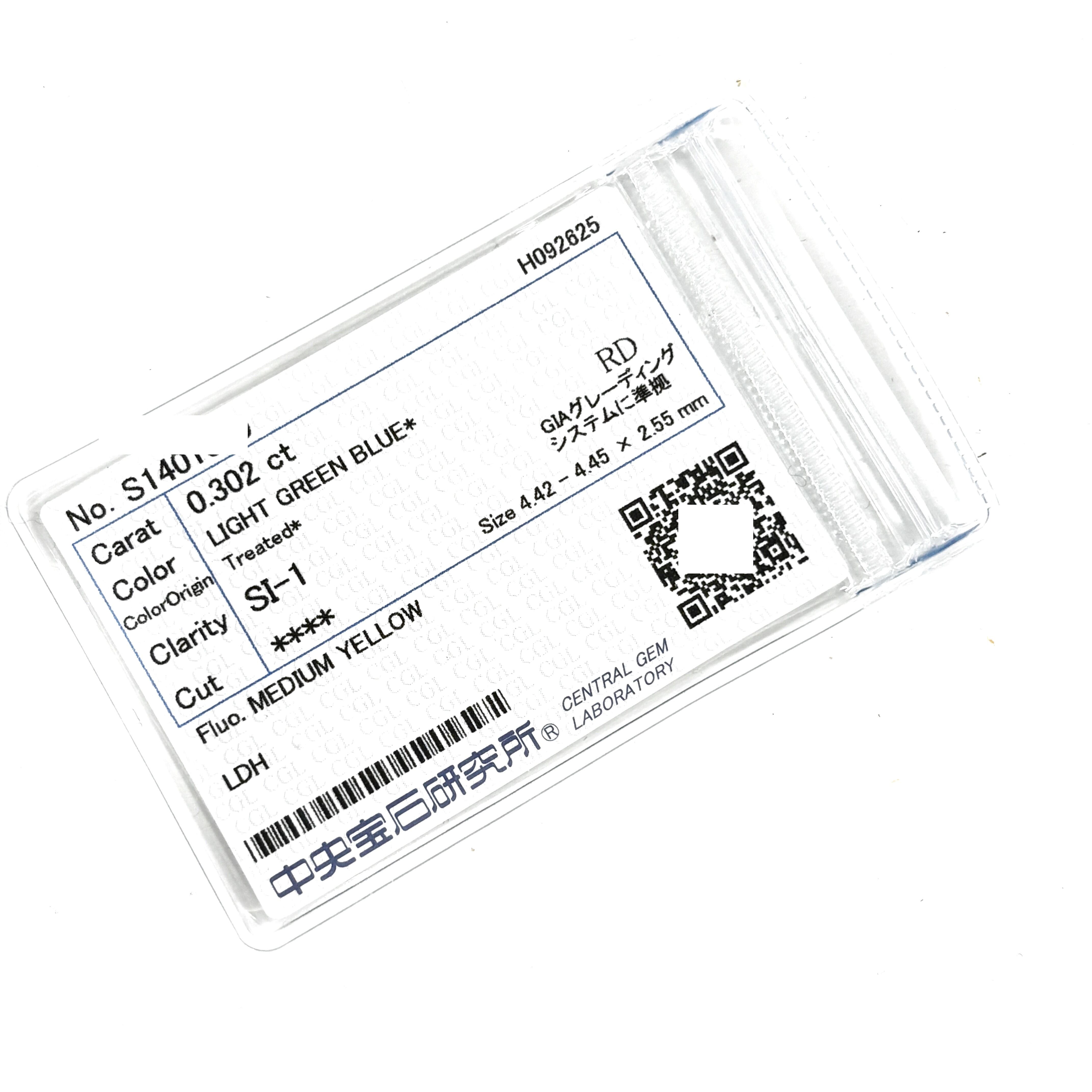 【卸売価格】 0.302ct アイスブルー ダイヤモンド Light Green Blue ブルー ダイヤモンド ルース 裸石 トリート ダイヤモンド 中央宝石研究所ソーティング ラウンドブリリアント 0.3ct 4.4mm 蛍光 蛍光ダイヤモンド Treated Blue Diamond