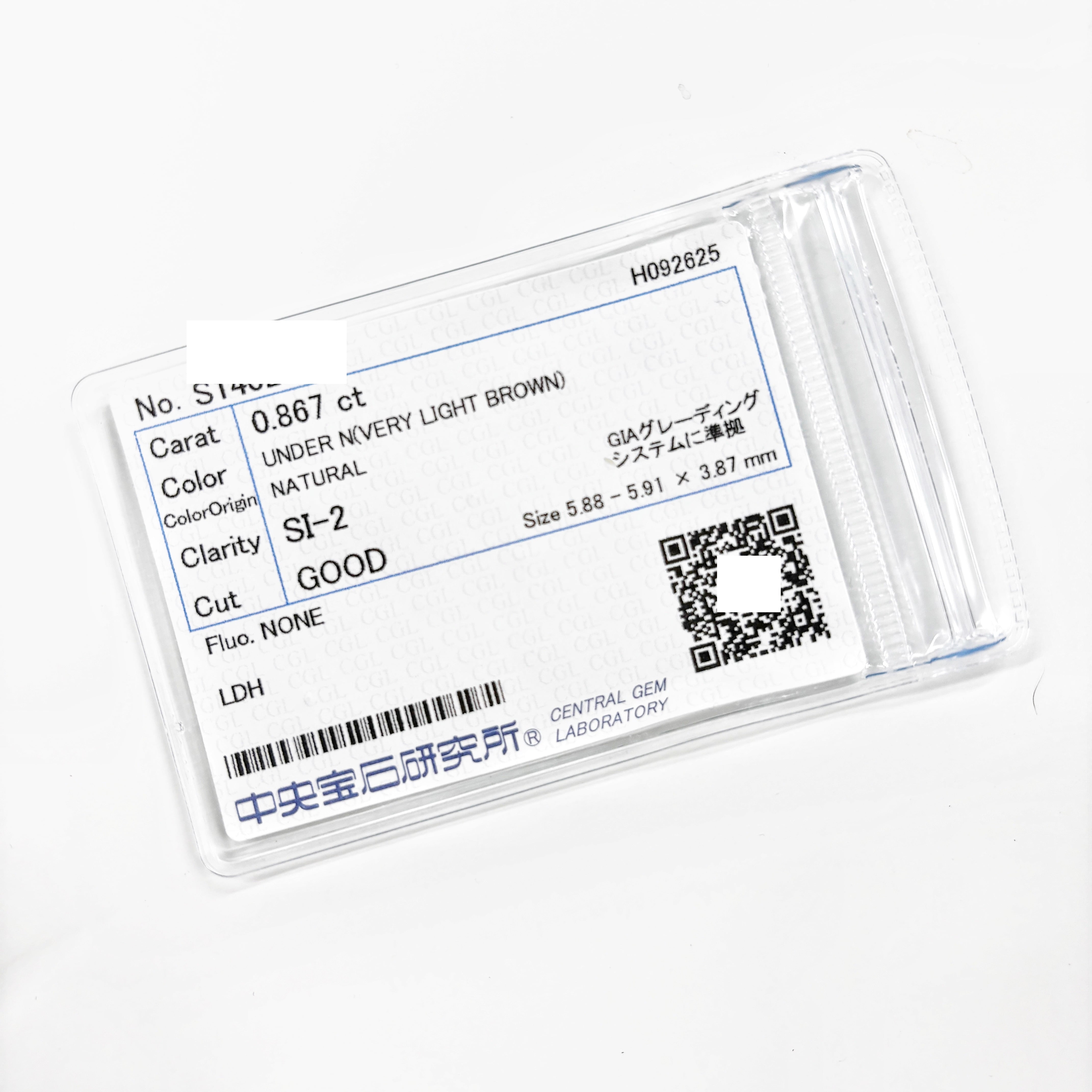 0.867カラットの Very Light Brown、天然ダイヤモンドです。