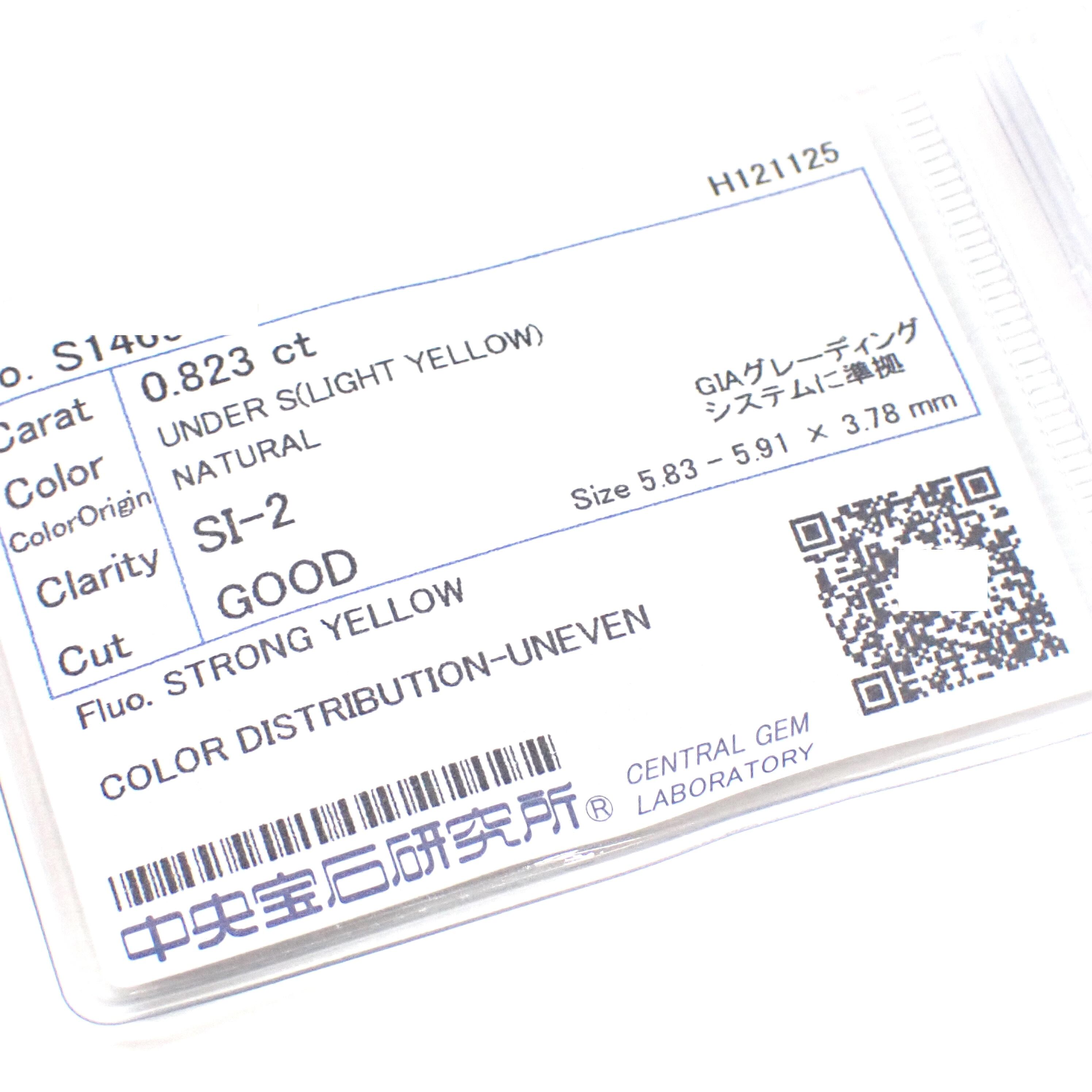 【蛍光】 大粒 0.823ct Light Yellow SI2 Good 天然 イエロー ダイヤモンド ルース 裸石 中央宝石研究所ソーティング 蛍光 イエロー ダイヤモンド 希少石 Natural Yellow Diamond 0.8ct
