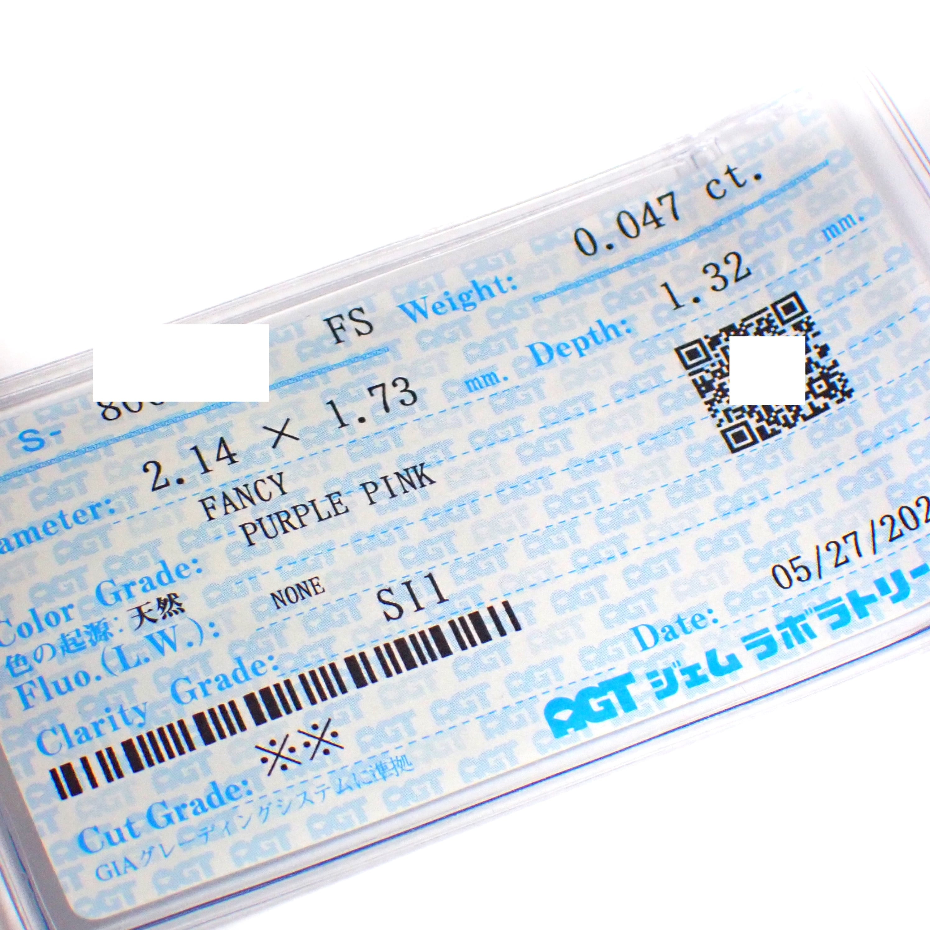 【特価】 0.047ct Fancy Purple Pink ファンシー パープル ピンク ダイヤモンド ルース 裸石 AGTソーティング 天然 ピンク ダイヤモンド パープル ダイヤモンド クッションカット Natural Pink Diamond Cushion Cut