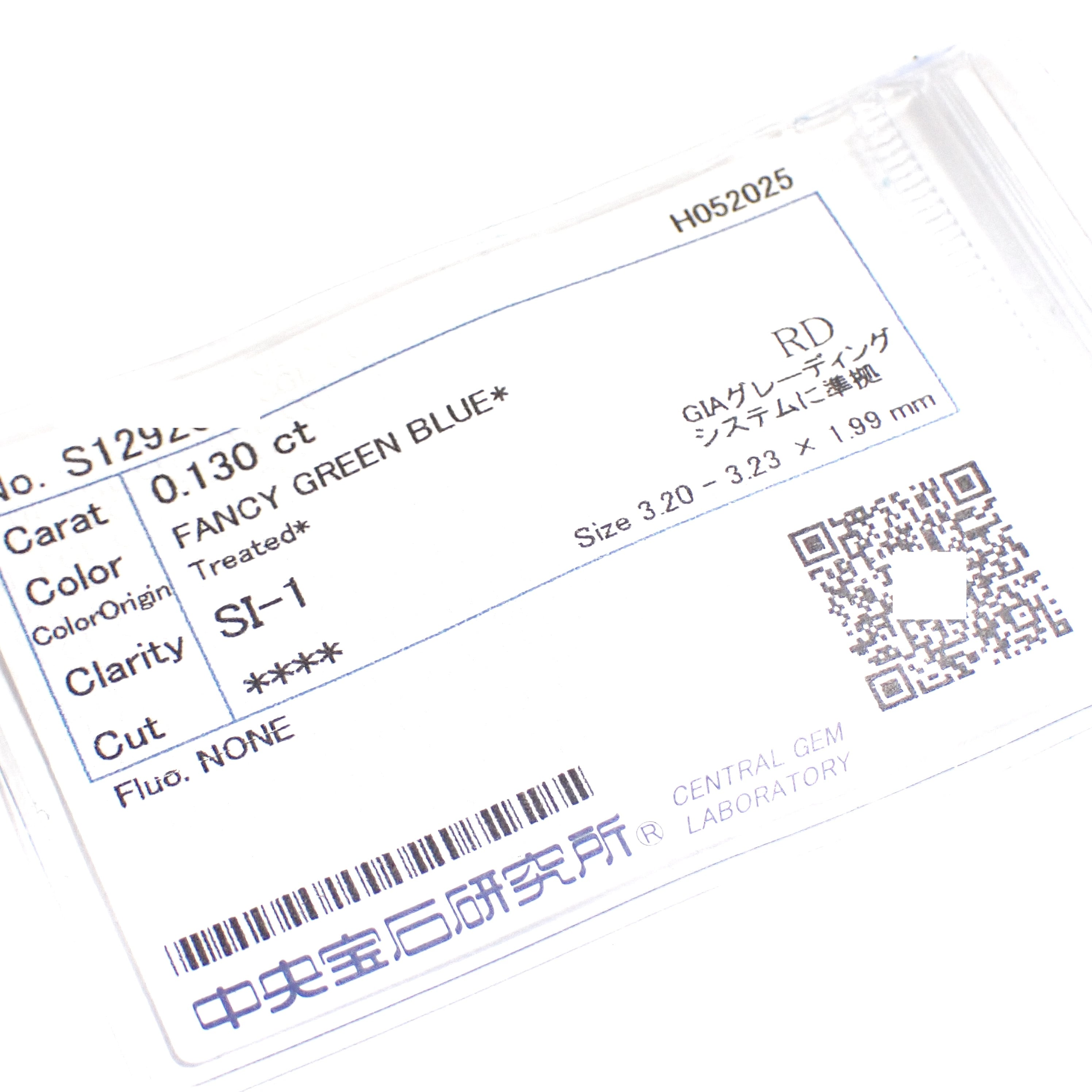 【卸売価格】 0.130ct アイスブルー ダイヤモンド Fancy Green Blue SI1 ブルー ダイヤモンド ルース 裸石 トリート ダイヤモンド 中央宝石研究所ソーティング ラウンドブリリアント 0.1ct 3.2mm Treated Blue Diamond Ice Blue