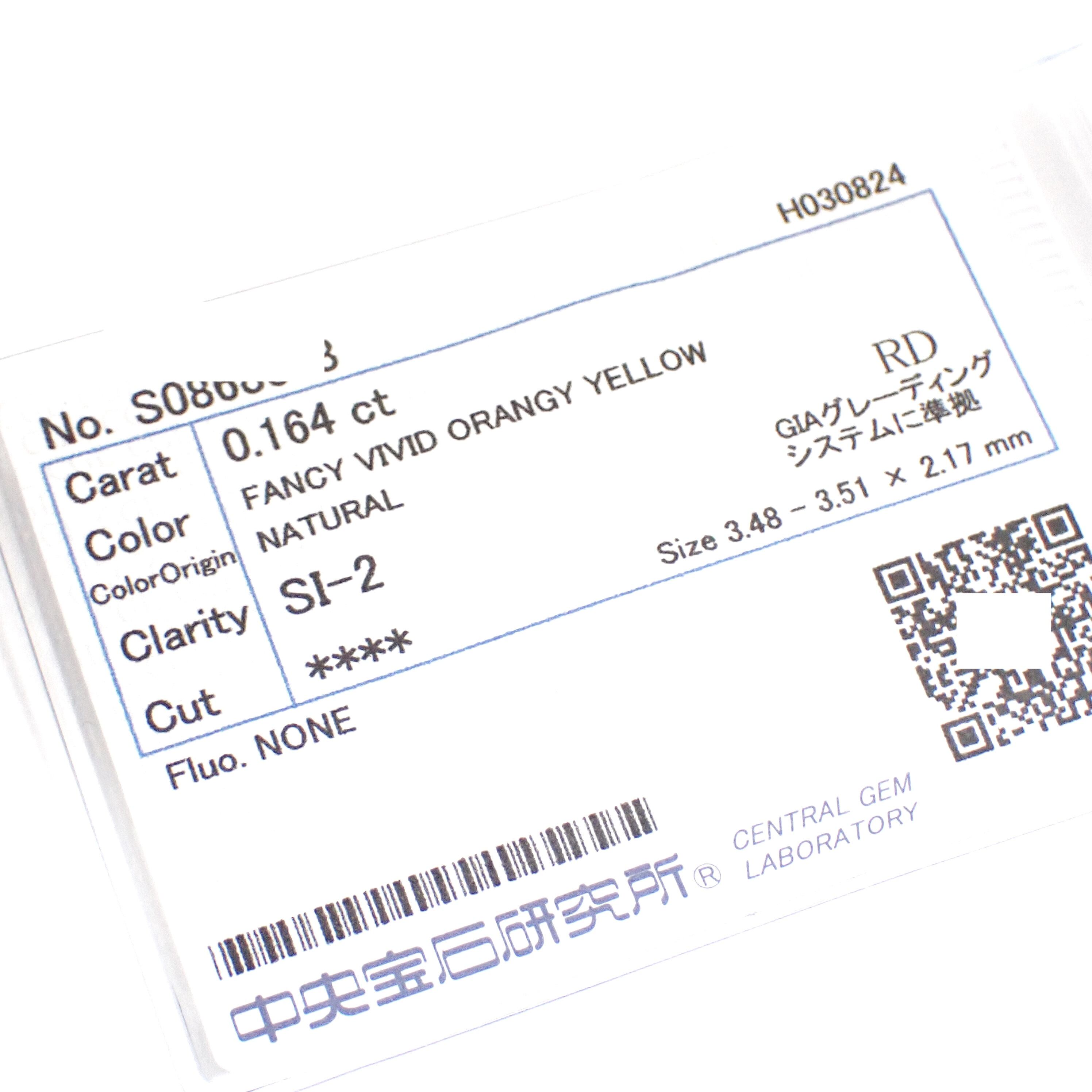 【希少】0.164ct Fancy Vivid Orangy Yellow SI2 ファンシー ビビッド オレンジ イエロー ダイヤモンド ルース 裸石 中央宝石研究所ソーティング カラーダイヤモンド ラウンド ダイヤモンド 0.1ct 0.1 carat Natural Yellow Diamond Orange Diamond