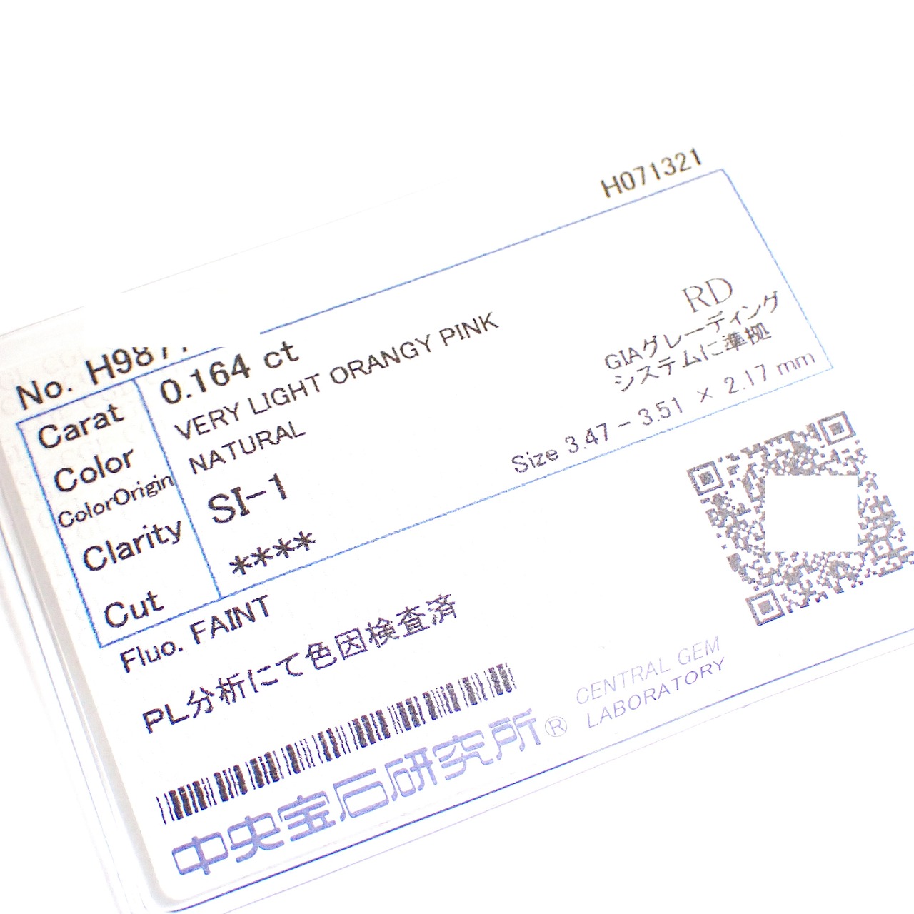 こちらは 0.164ct の天然ピンクダイヤモンド。