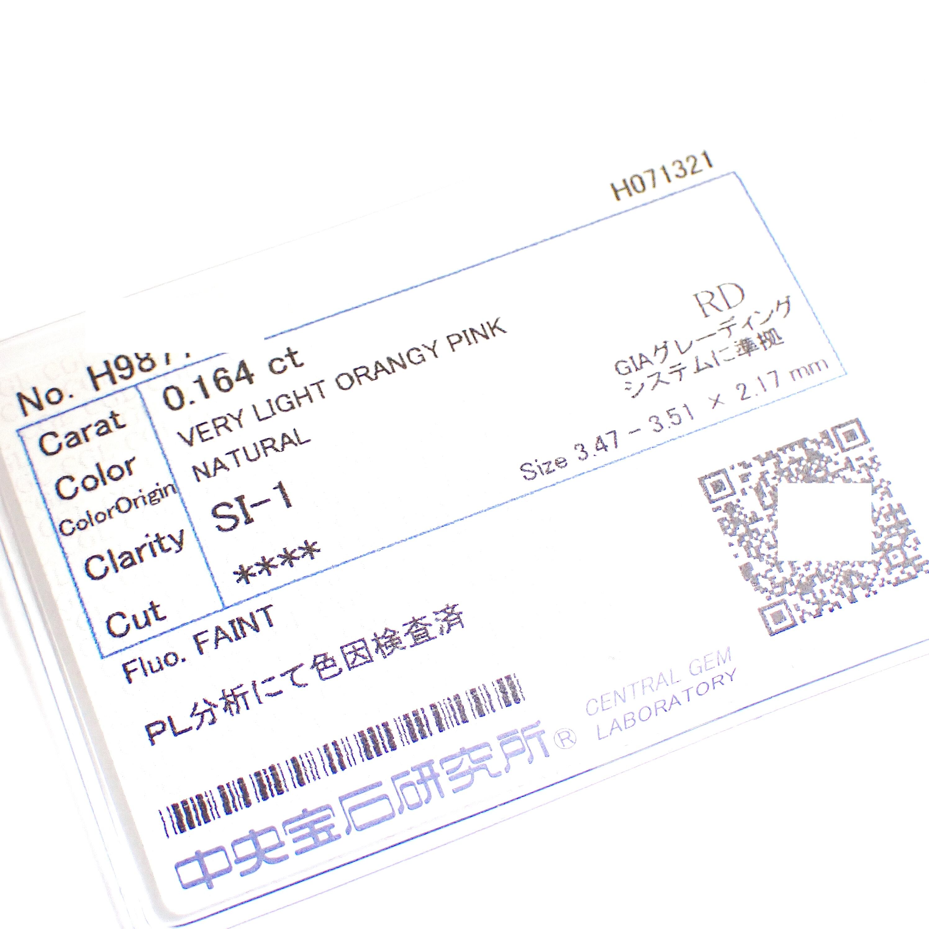 【希少】 0.164ct Very Light Orangy Pink SI1 天然 ラウンド ピンク ダイヤモンド ルース 裸石 中央宝石研究所ソーティング 0.1カラット Natural Pink Diamond